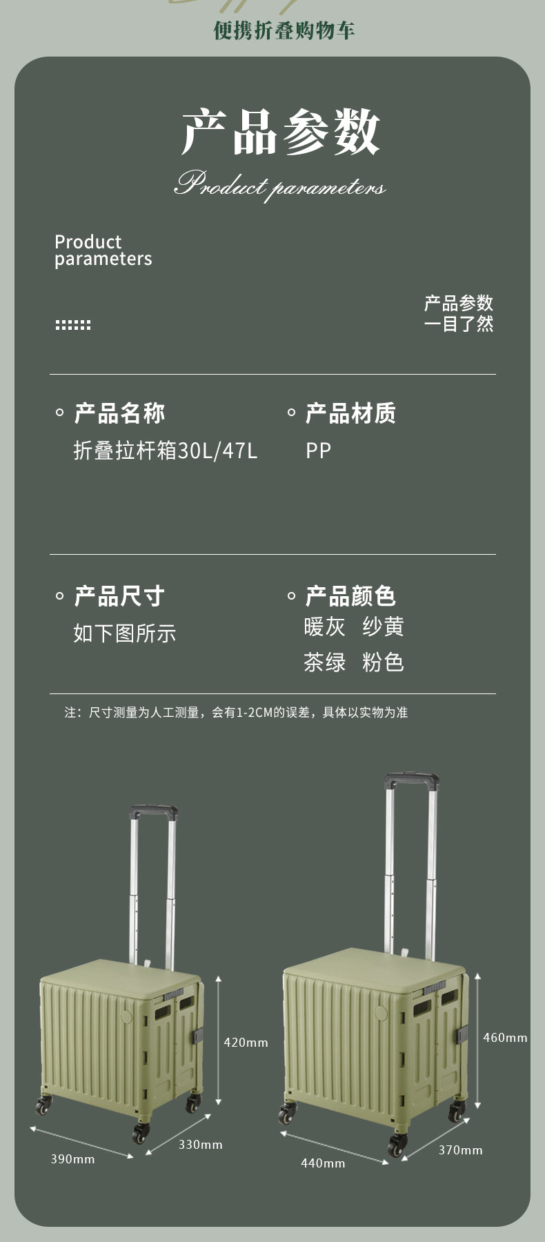 品牌名稱:www.17c.com 生產地區:中國·浙江·台州 產品貨號:TL3880 裝箱數:1/4 產品尺寸:39x32x42cm 外箱尺寸:40.5x12x45cm/43.5x40.5x45cm 條形碼:6931643825627 www.17c.comTL3880 中號折(shé)疊拉杆箱 30L