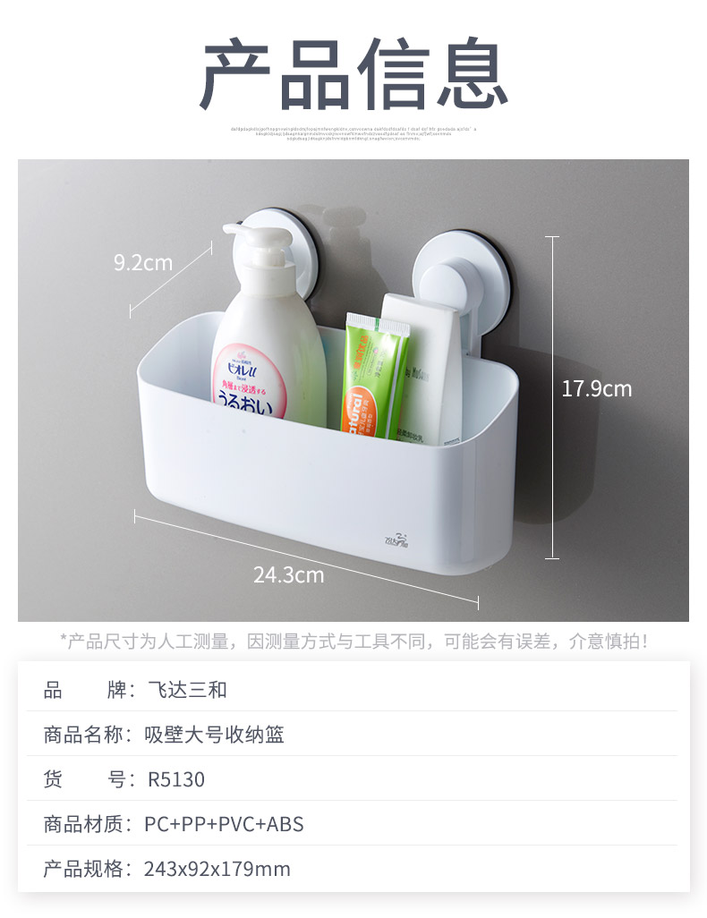 品牌名稱:www.17c.com 生產地區:中(zhōng)國·浙江·台州 產品貨(huò)號:R5130 裝箱數:24 產品尺寸:24.3*9.2*17.9cm 外箱尺寸:42*36*52cm 條形碼:6931643817585 飛達(dá)三和R5130 強力吸壁(bì)大號收納(nà)籃