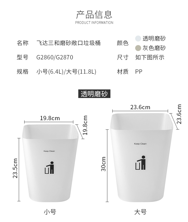 品牌名稱:飛達三(sān)和 生產地區:中國·浙(zhè)江(jiāng)·台州 產品(pǐn)貨號:G2860/G2870 裝箱數:48 / 36 產品尺寸(cùn):19.5*19.5*23.5 / 23.1*23.1*29cm 外箱尺寸:59.5*40.5*42 / 47.5*47.5*51.5cm 條(tiáo)形碼:6931643817981 / 6931643817998 www.17c.comG2860 方形垃圾桶(tǒng) 6.4L / G2870 方形垃圾桶 11.8L